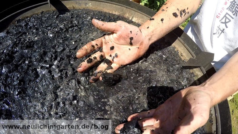 Die Kohle ist fast fertig. Nur noch abloeschen, trocknen und zerkleinern.